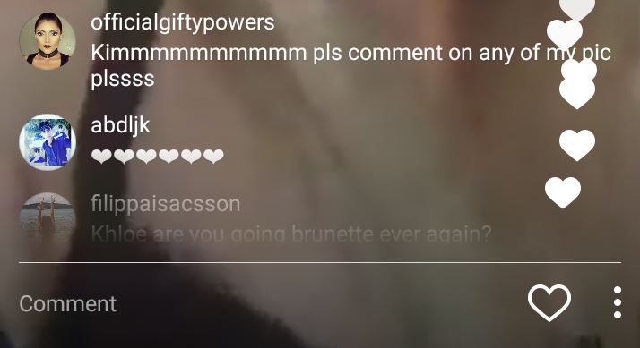The ex-Big Brother Naija contestant, was nabbed begging reality TV star, Kim Kardashian for a comment on any of her photos – in an IG live video the reality TV was putting up on her page, Gifty‘s comment was clearly seen begging the star for a comment.