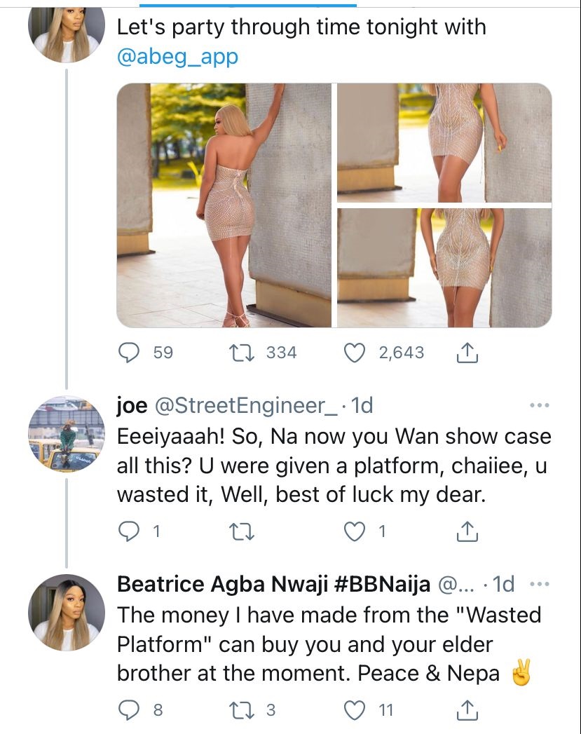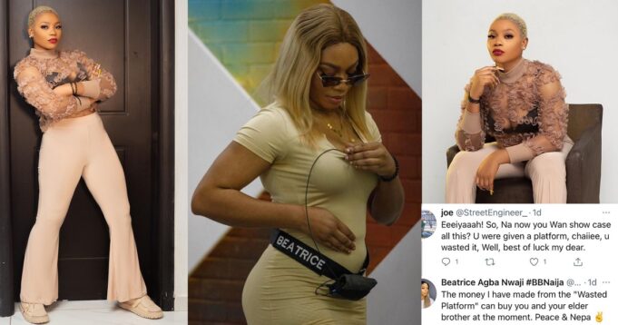Former Big Brother Naija ‘shine ya eye’ housemate, Beatrice has lambasted a troll who accused her of wasting the BBNaija platform.