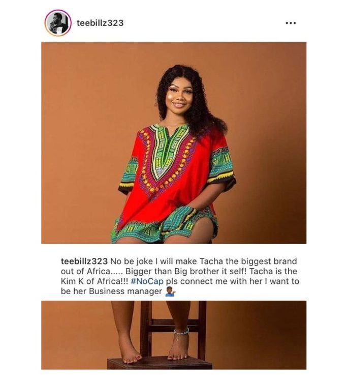 Talent Manager, Teebillz has said he believes Tacha is “the most bankable brand out of all” the Big Brother Naija season 4 housemates as he defended her in a new post on social media.