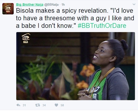 Mother of one and one of top 5 Big Brother Naija housemates, Bisola has just revealed that ‘She would love to have a threesome with a guy she likes and a babe she doesn’t know‘