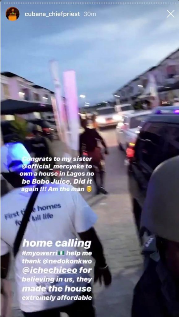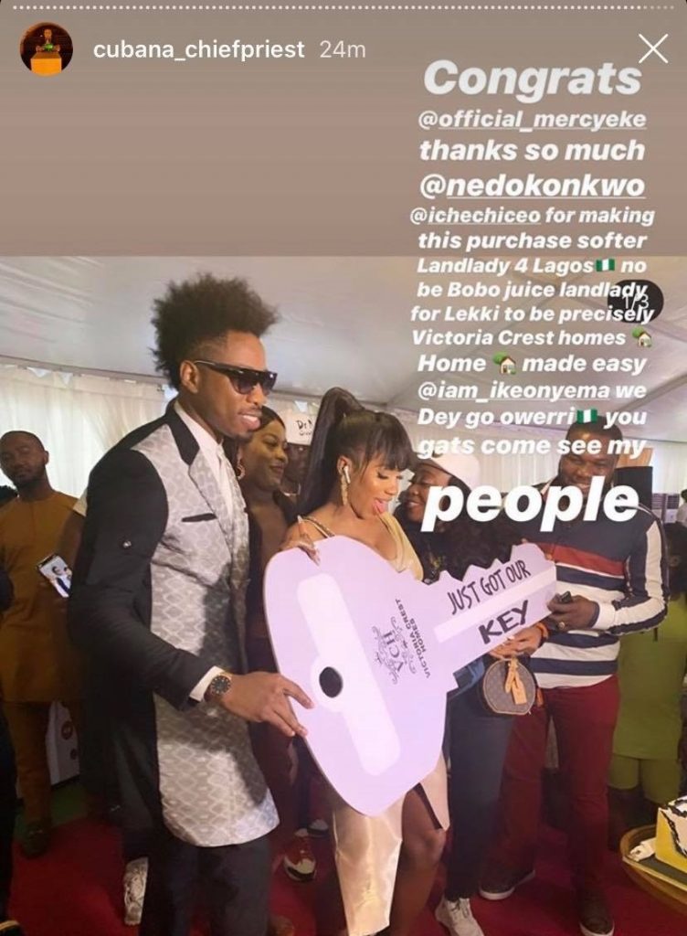 “Congrats Mercy, Thanks so much, Ned Okonkwo for making this purchase softer Landlady 4 Lagos. No be Bobo juice. Landlady for Lekki to be precise – Victoria Crest Homes. Home made easy, Ike. We dey go owerri, you gats come see my people”, wrote Cubana Chief Priest.
