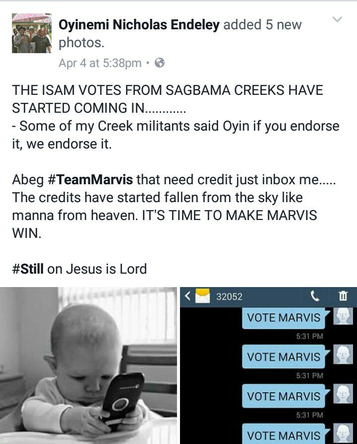 “THE ISAM VOTES FROM SAGBAMA CREEKS HAVE STARTED COMING IN – Some of my Creek militants said Oyin if you endorse it, we endorse it.