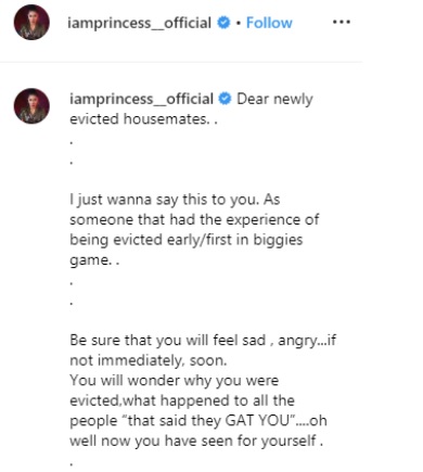“Dear newly evicted housemates. I just wanna say this to you. As someone that had the experience of being evicted early/first in biggies game. .Be sure that you will feel sad , angry…if not immediately, soon.