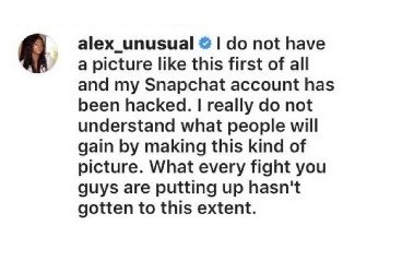 I do not have a picture like this first of all and my Snapchat account has been hacked. I really do not understand what people will gain by making this kind of picture. What every fight you guys are putting up hasn’t gotten to this extent.