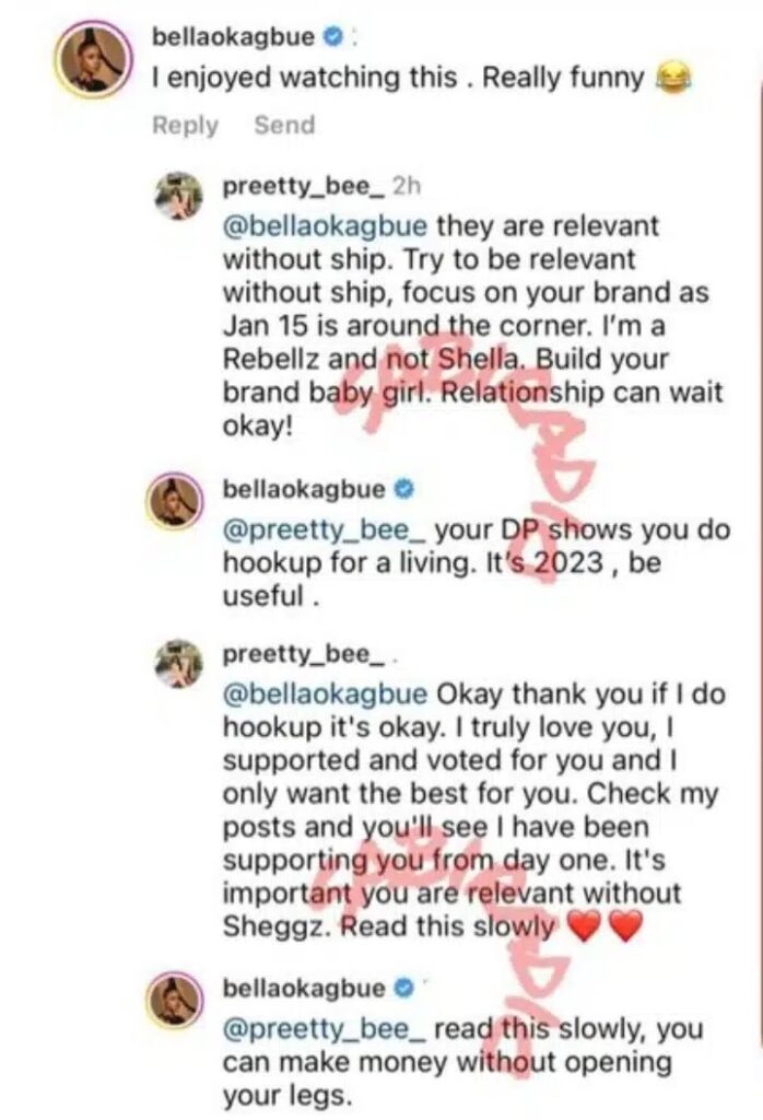 “@preetty_bee_ your DP shows you do hookup for a living. it’s 2023 , be useful,” Bella wrote.