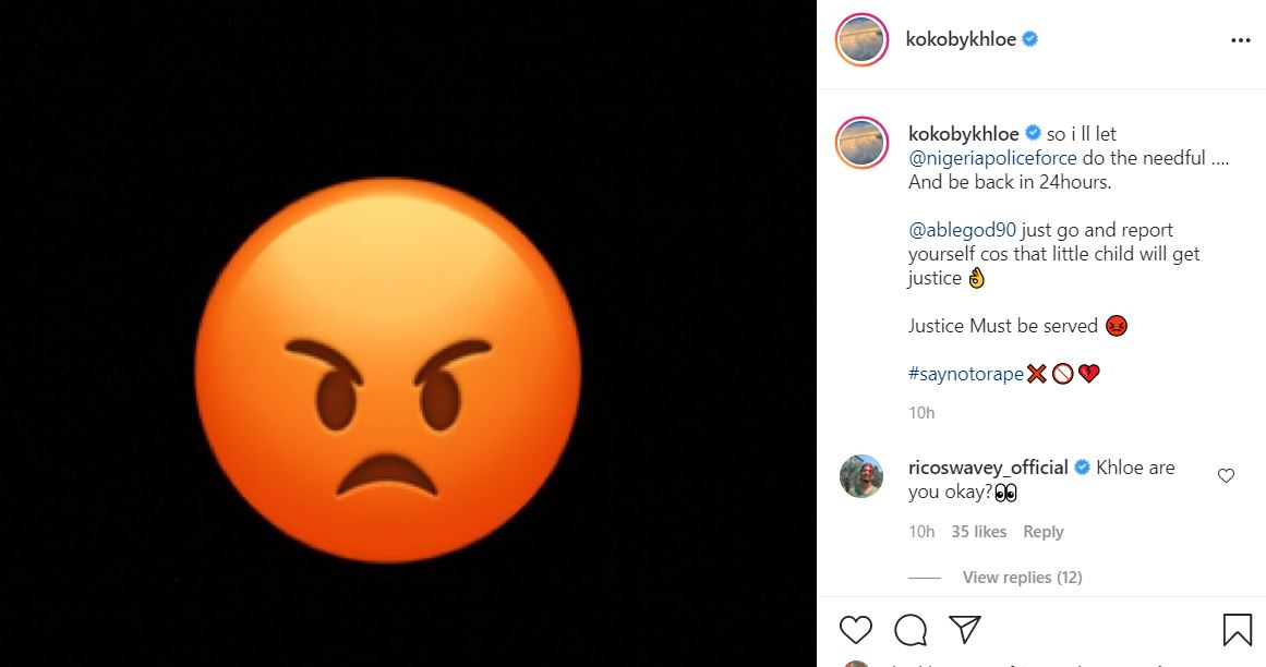 In a subsequent post the former Big Brother Naija housemate wrote, “so i’ll let @nigeriapoliceforce do the needful …. And be back in 24hours. @ablegod90 just go and report yourself cos that little child will get justice 👌 Justice Must be served 😡 #saynotorape❌🚫💔.”