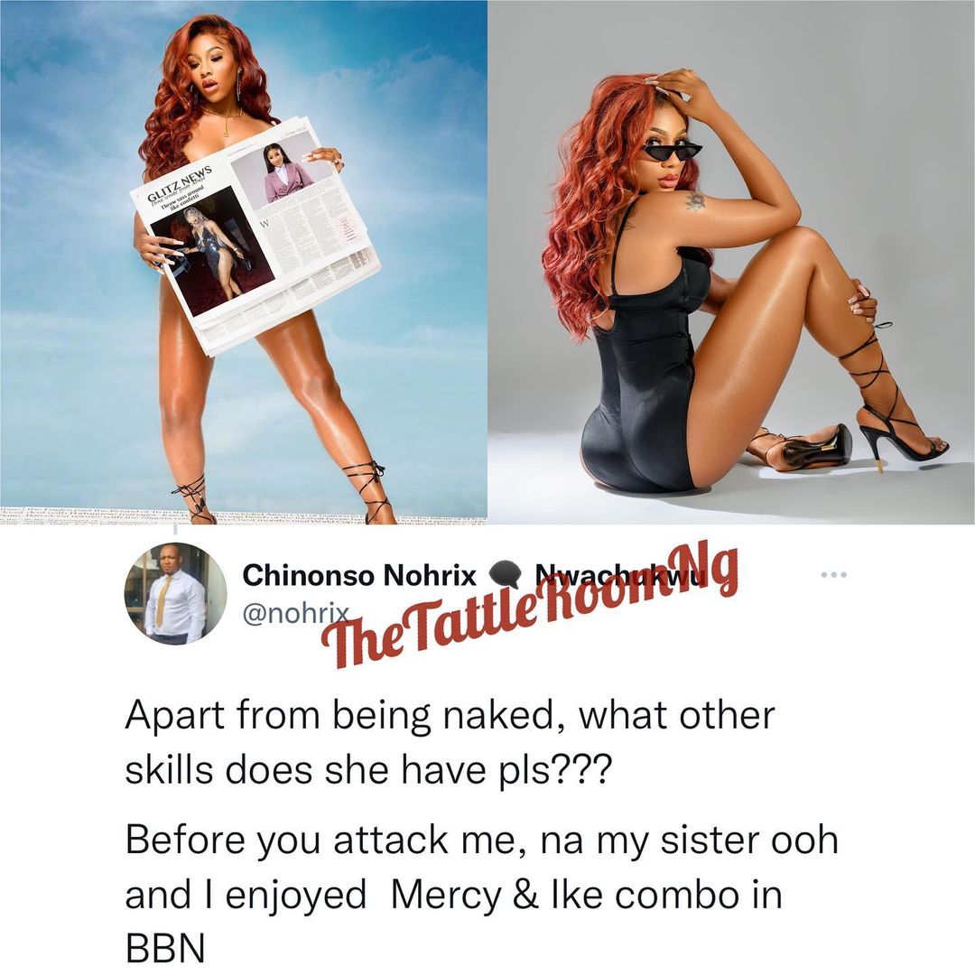 Big Brother Naija ‘Pepper Dem’ winner, Mercy Eke has schooled a follower who questioned her other skills aside from posing naked online.