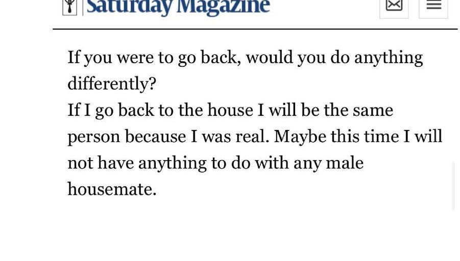 “If I go back to the house I will be the same person because I was real. Maybe this time I will not have anything to do with any male housemate”.