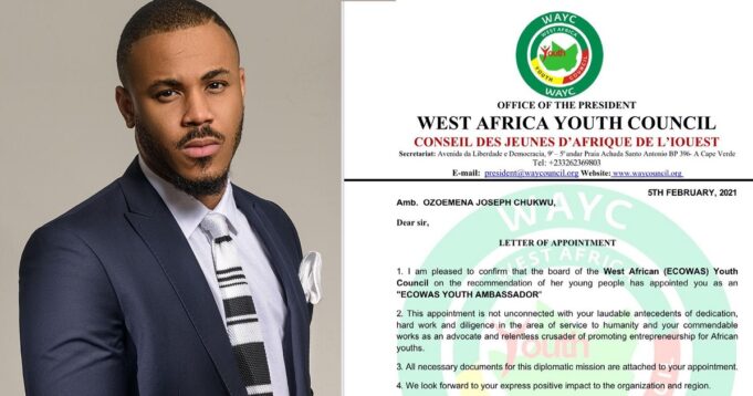 Reality TV star, Ozoemena Joseph Chukwu simply known as Ozo, has been appointed as an ECOWAS Youth Ambassador by the West Africa Youth Council.