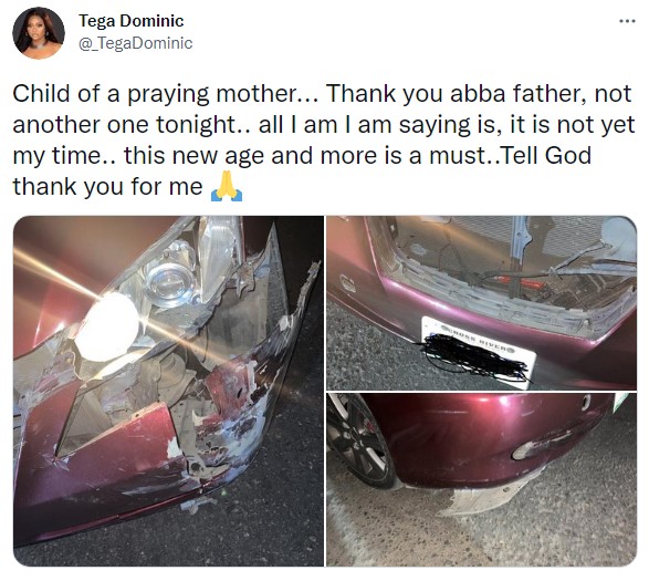 Big Brother Naija star, Tega has taken to social media to express gratitude to God after surviving a freak accident.