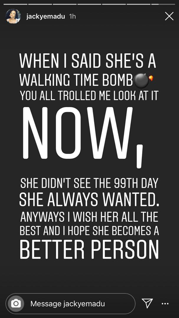 Former Big Brother Naija housemate, Jackye has reacted to the recent disqualification of controversial housemate, Tacha as she says she’s a walking time bomb.