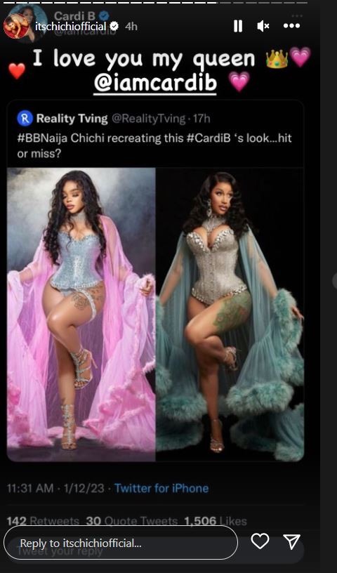 An excited Chichi then took to her Instagram stories to share snapshots of Cardi B’s reaction and expressed her love for the rapper.