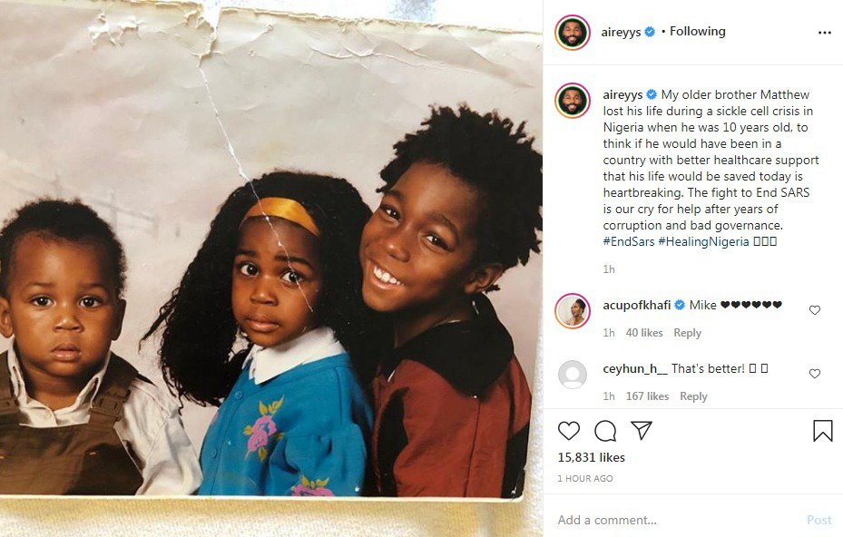 He wrote, “My older brother Matthew lost his life during a sickle cell crisis in Nigeria when he was 10 years old, to think if he would have been in a country with better healthcare support that his life would be saved today is heartbreaking. The fight to End SARS is our cry for help after years of corruption and bad governance.