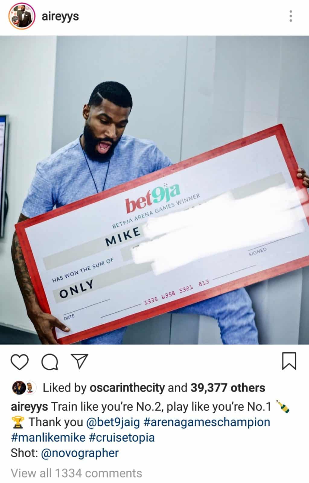 Big Brother Naija: Pepper Dem housemate and 1st runner up, Mike Edwards has received his cash prize from the Bet9ja Arena games which he won during the reality show.