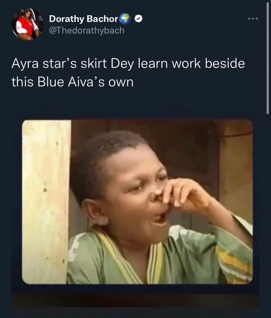 Taking to Twitter to share her opinion, Dorathy stated that singer Ayra Starr’s regular miniskirts doesn’t come close to the skirt Blue Aiva donned to the party. It’s no news that the Mavin Records’ star have created a brand off wearing skimpy outfits.