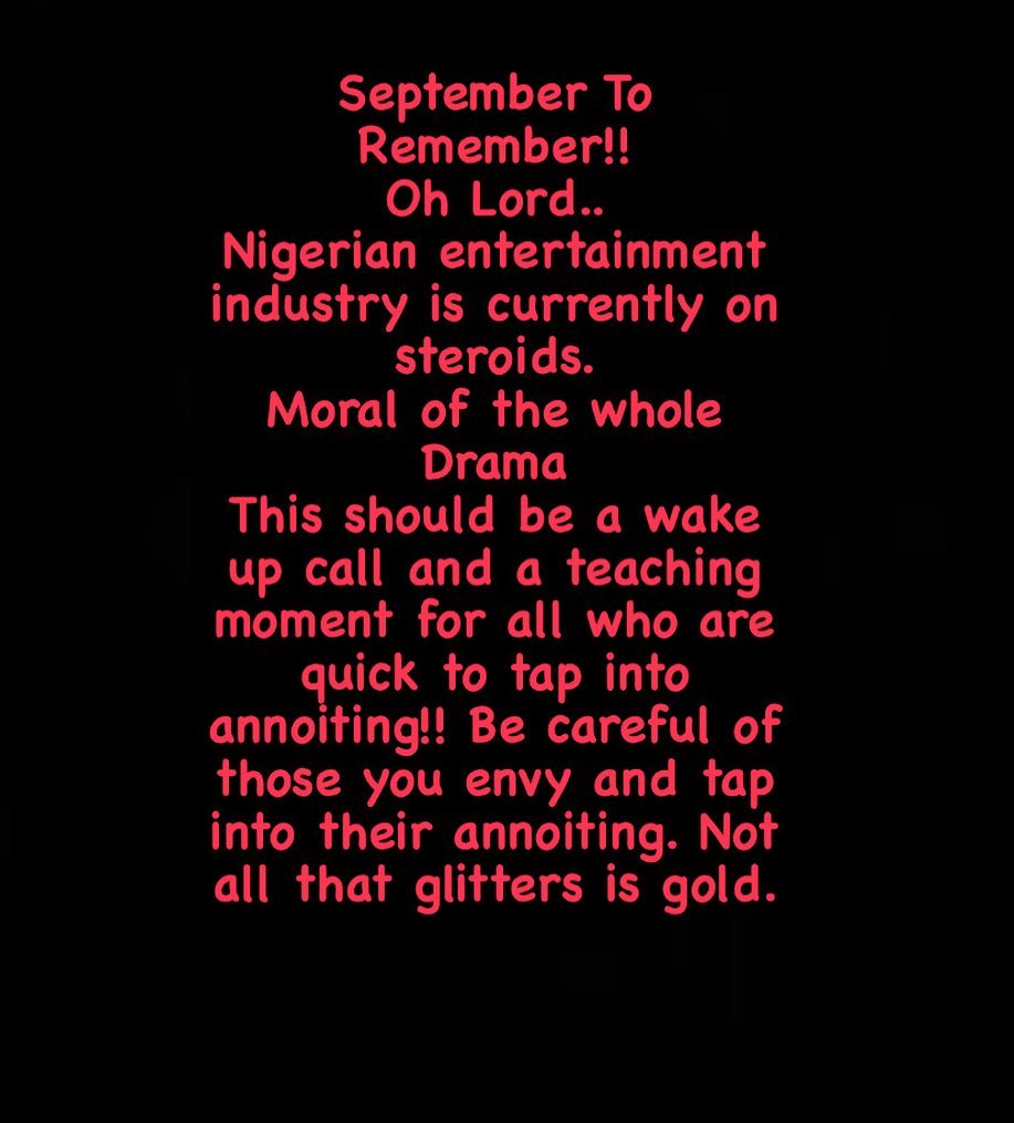September To Remember!! Oh Lord.. Nigerian entertainment industry is currently on steroids. Moral of the whole Drama This should be a wake up call and a teaching moment for all who are quick to tap into annoiting!! Be careful of those you envy and tap into their annoiting. Not all that glitters is gold.