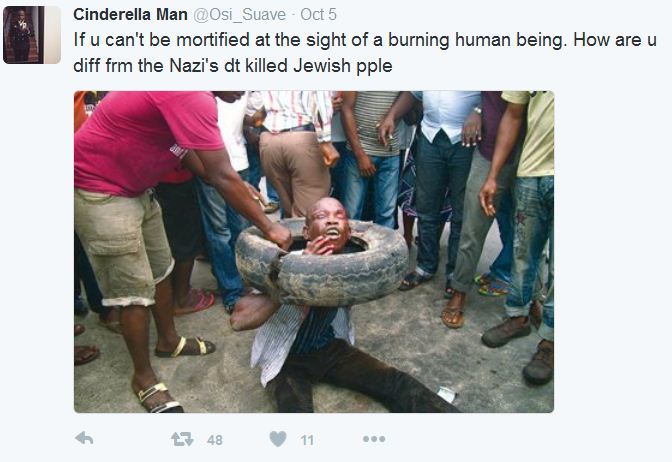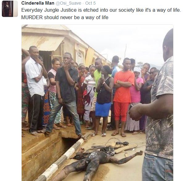 Beat 99.9 OAP, Osi Suave, in a series of tweets yesterday, aired his thoughts on jungle justice in our society. “Jungle justice” usually involves a suspected robber or thief beaten to pulp by a mob, and then set ablaze with petrol, tires and matches.