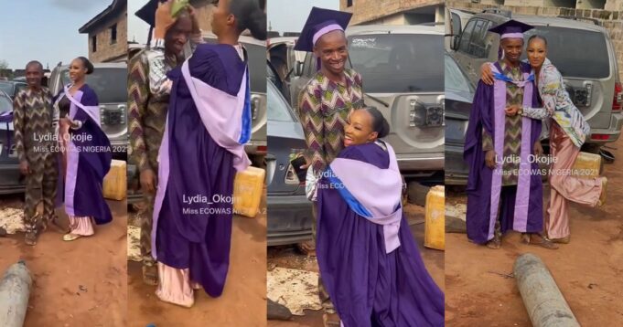 The tear-jerking beautiful moment a fresh Nigerian female graduate ran up to her father’s workshop to embrace him and clothe him in her convocation gown has melted hearts on social media.