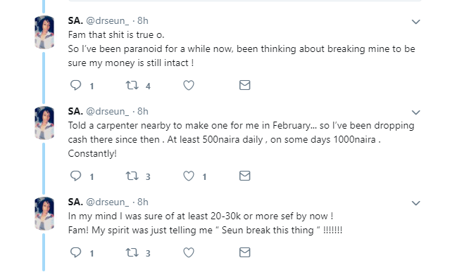 4. lol,,, it happens to my wife too. she saved alot into her own kolo for a long time, from last year December till this year March ending. something just pushed her to break the koko. at list have gave her nothing less than 15k personally apart from the ones she saved too. unfortunately she break it and behold she found #6500 ? . only 2 #1000 notes, ? after up to 12 #1000 notes I gave her o boy my wife cried o. but have to console her and share her part of my own. because thank God mine was more than hers when I broke mine kolo too. this stuff is from those guys making/building the kolo.