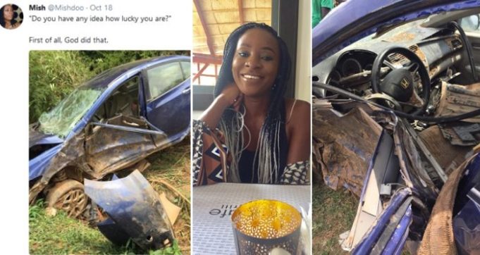 The lady, Mish on Twitter survived an auto crash in Wuse area of Abuja, that left her car badly damaged – she shared photos from the accident scene.