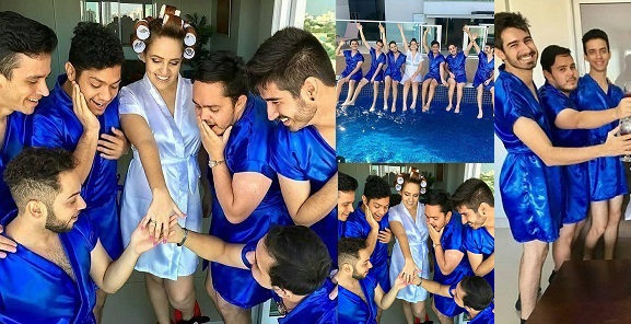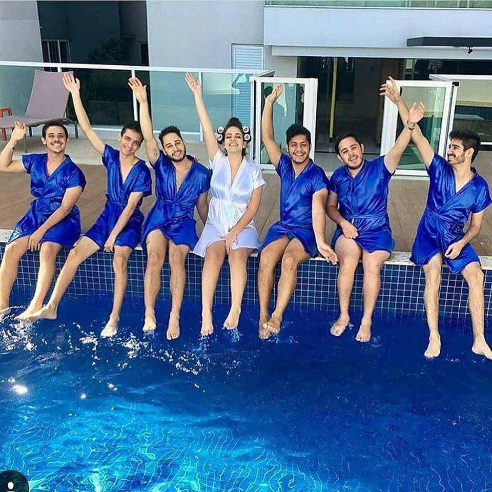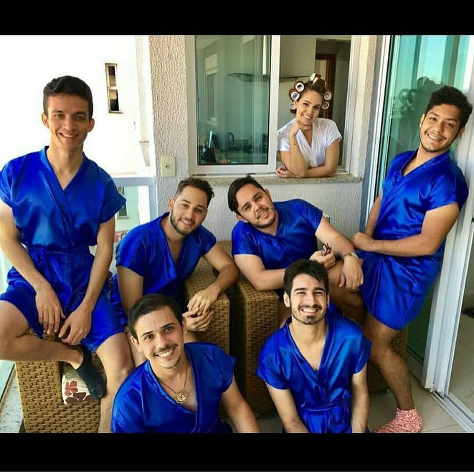 The bride donned a white bathroom robe, while the bridemen donned a blue bathroom robe.