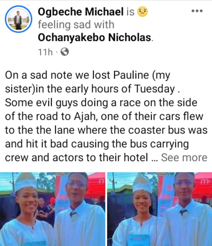 “On a sad note we lost Pauline (my sister) in the early hours of Tuesday. Some evil guys doing a race on the side of the road to Ajah, one of their cars flew to the the lane where the coaster bus was and hit it bad causing the bus carrying crew and actors to their hotel to somersaulted in the process.