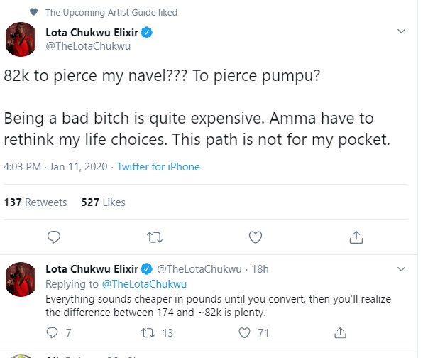 ”82k to pierce my navel??? To pierce pumpu? Being a bad bitch is quite expensive. Amma have to rethink my life choices. This path is not for my pocket.”
