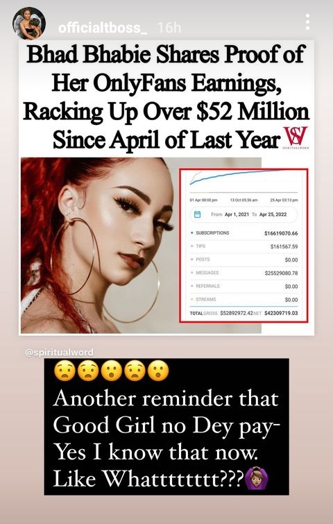 Reposting a report of Bhad Bhadie’s earnings on her Instastory, the mother of one stated that it goes to show that being a morally upright lady is not beneficial.