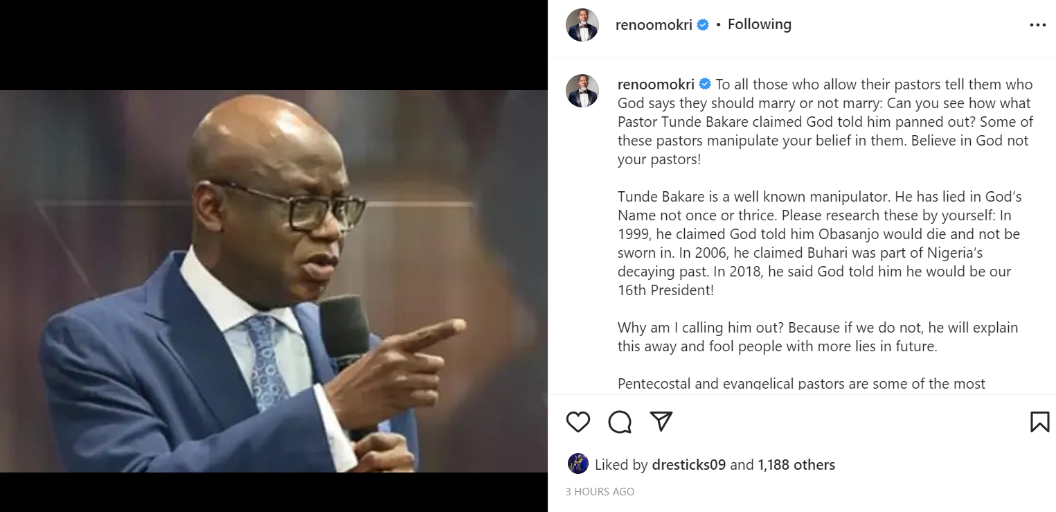 Social media commentator, Reno Omokri has called out Pastor Tunde Bakare after his prophecy of becoming the next President of Nigeria fell to the ground following his loss at the APC Presidential primary.