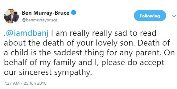 Ben Murray Bruce has joined other Nigerians in consoling D’banj over the death of his 13 months old son, Daniel the 3rd who drowned yesterday.