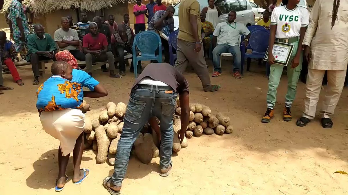 A National Youth Service corps member in Benue state, Iyanuoluwa Moyinoluwa, was appreciated with 80 tubers of yam by members of Pila community in the state after she funded a borehole water system for them.