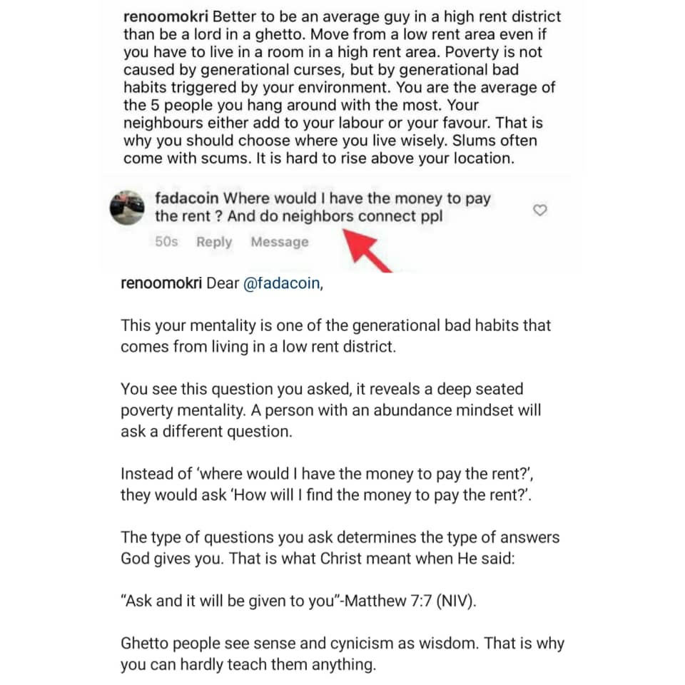 “Better to be an average guy in a high rent district than be a lord in a ghetto. Move from a low rent area even if you have to live in a room in a high rent area. Poverty is not caused by generational curses, but by generational bad habits triggered by your environment. You are the average of the 5 people you hang around with the most. Your neighbours either add to your labour or your favour. That is why you should choose where you live wisely. Slums often come with scums. It is hard to rise above your location.”