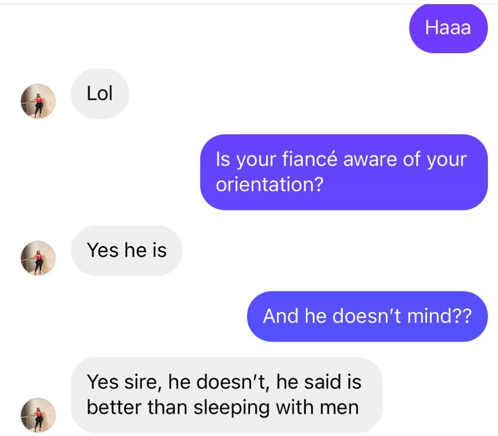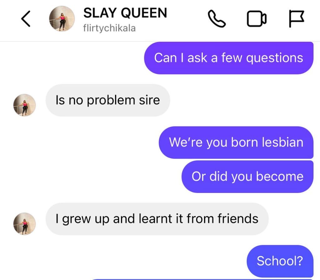 In the chat, the lady, who has “Proud Lesbian” and “LGBTQ” boldly written on her Instagram bio, claimed she wasn’t born a lesbian, but learnt the act from her friends.