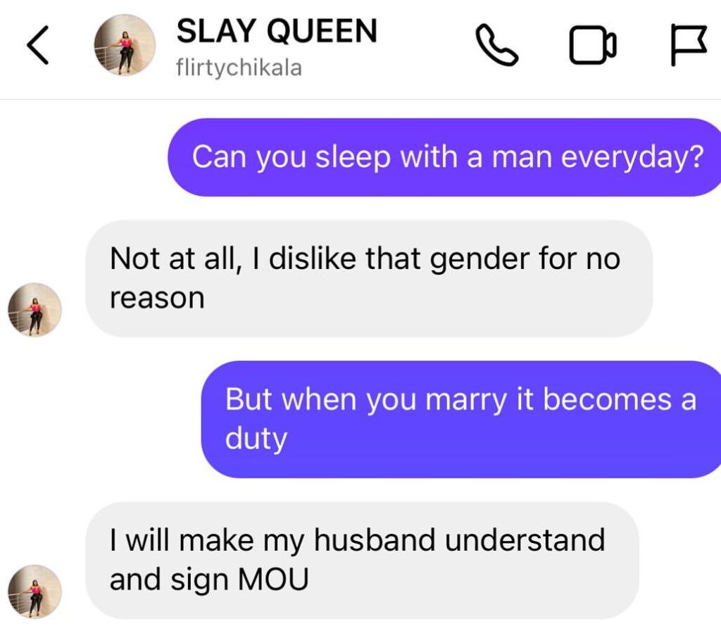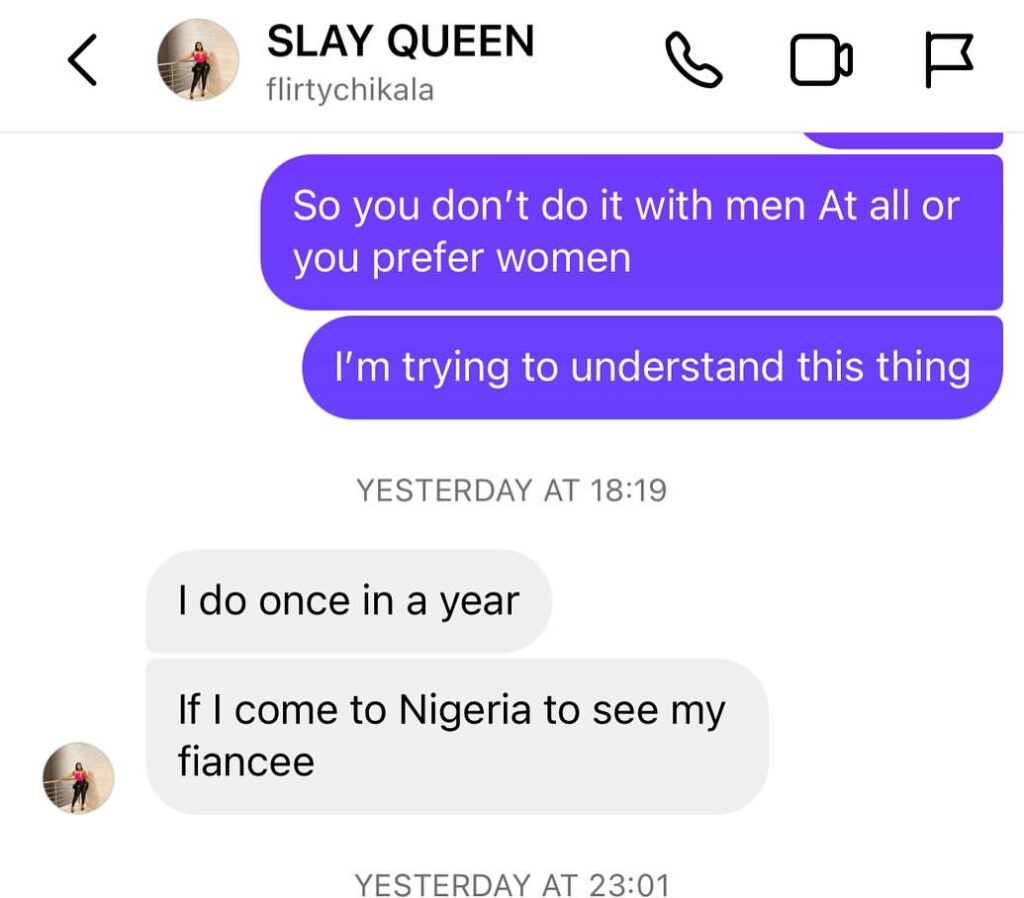 Freeze took to his Instagram page to post screenshots of his conversation with the lesbian where she opened up about her sexuality and relationship status.