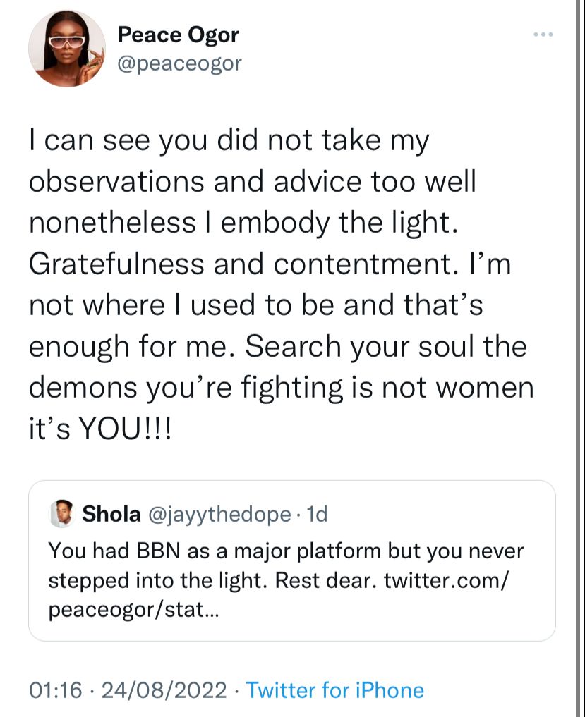 A mild altercation ensued between former Big Brother Naija housemate, Peace Ogor, and a self-styled ‘Alpha male’, Shola, on Twitter.