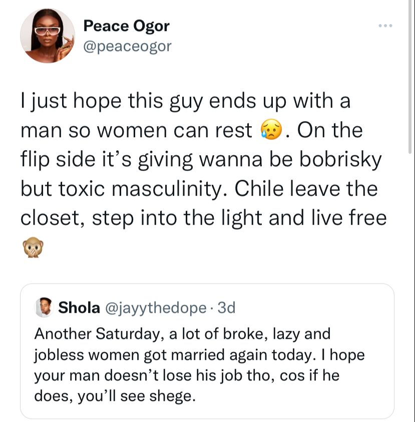 The tweet didn’t sit well with Peace and she expressed her displeasure with him, adding that he seems like a closeted gay men who feels better about himself whenever he talks down on women.