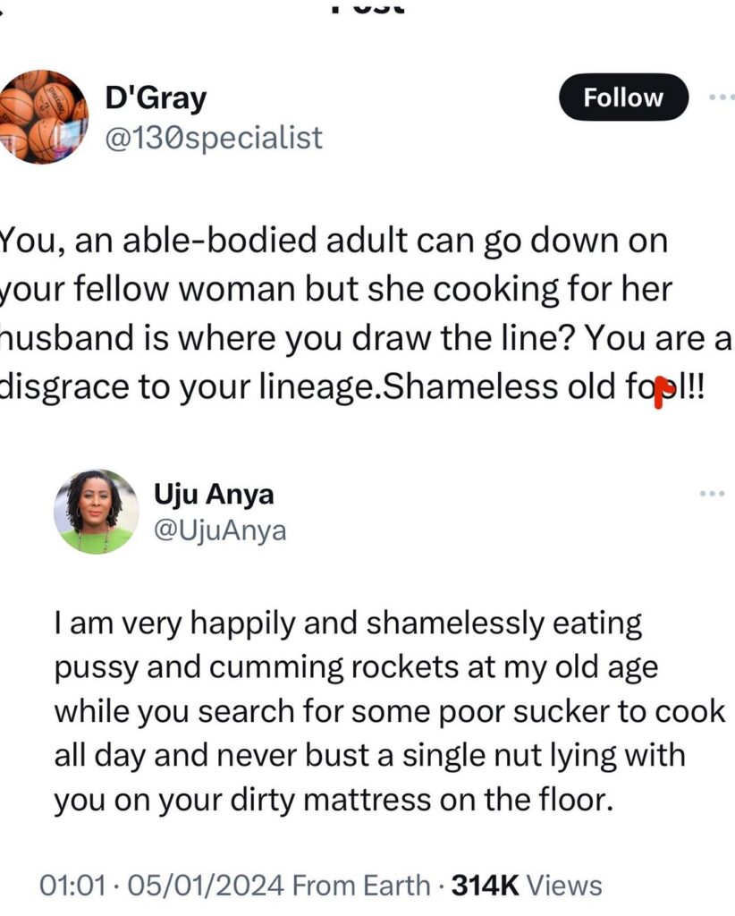 “You, an able-bodied adult can go down on your fellow woman, but cooking for her husband is where you draw the line? You are a disgrace to your lineage. Shameless old fool!!” they wrote.