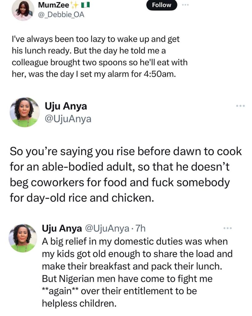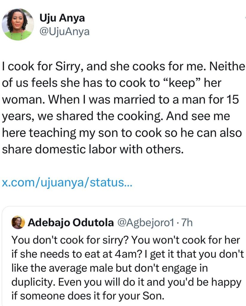 Uju Anya, known for being vocal about being a lesbian, also shared her perspective on the issue. She expressed displeasure with the woman waking up early to cook for her husband to prevent him from seeking food elsewhere.