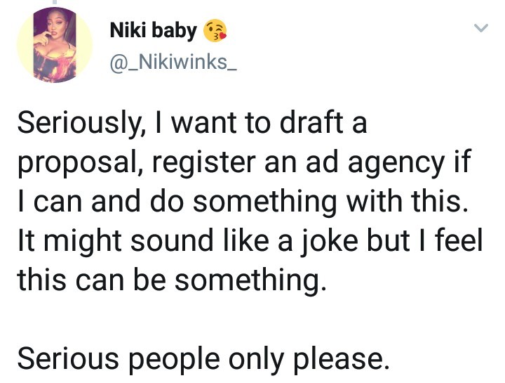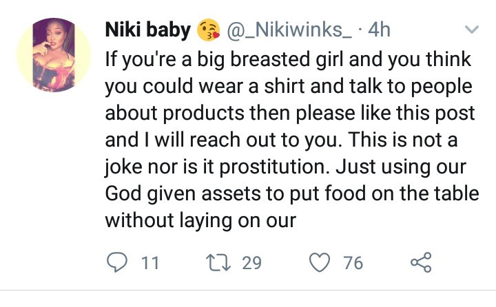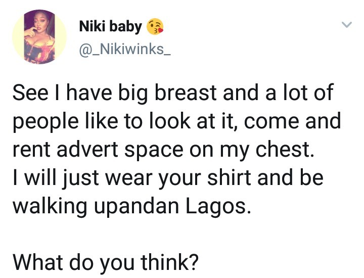 The lady, @_Nikiwinks_ on Twitter is offering to advertise on her chest and has encouraged brands looking for traffic to try her out.