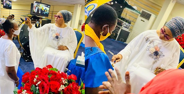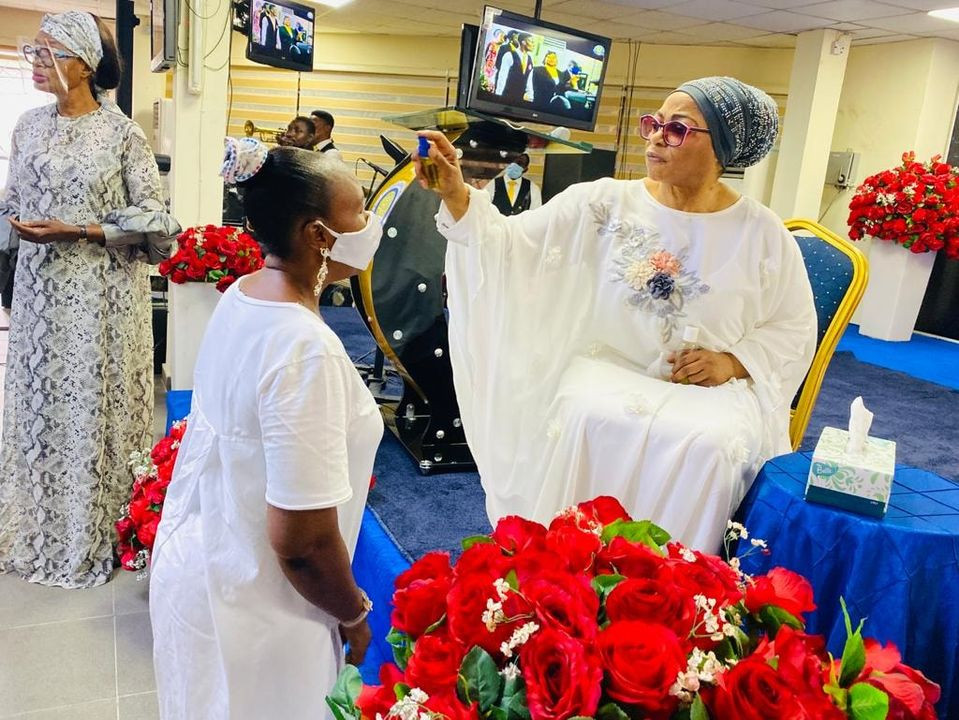 Nigerian billionaire businesswoman cum pastor, Folorunso Alakija was pictured anointing members of her church during an anointing service held on Tuesday, September 15.