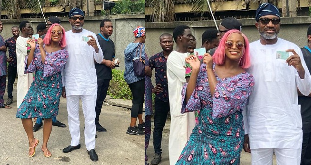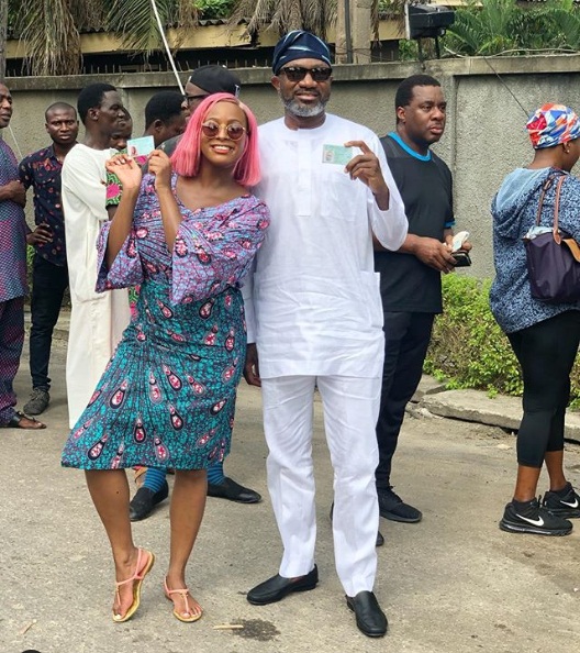 Billionaire Daughter, Florence Otedola who is popularly known as DJ Cuppy shared this photo of herself and her billionaire father, Femi Otedola at their polling unit where they will be casting their votes today.