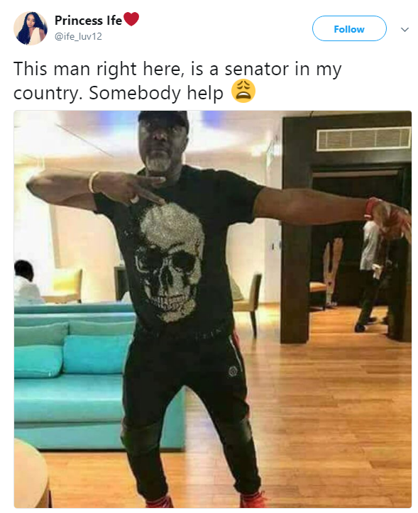 Yesterday, something happened on Twitter.. A Nigerian twitter user, shared a picture of Senator Dino Melaye, dancing and swagging, she complained bitterly about him and wrote; “This man right here, is a senator in my country. Somebody help..”
