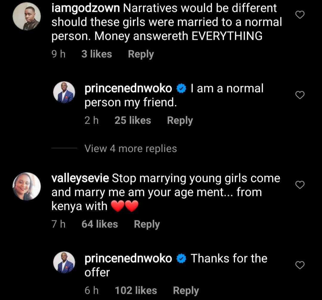 One woman, identified as @valleysevie on Instagram, advised him to stop marrying young girls and marry her instead because they are agemates. In response, Ned simply appreciated her for the offer.