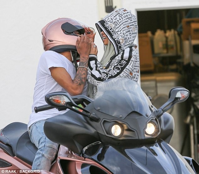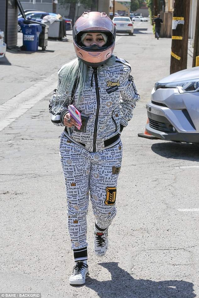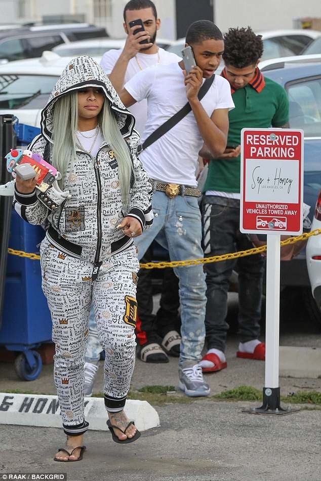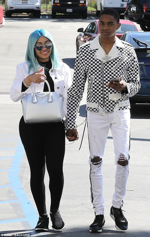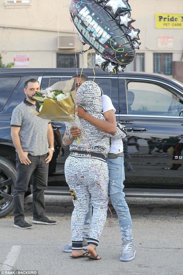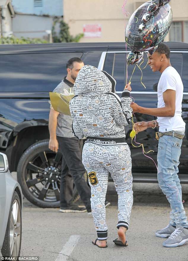 Blac Chyna 18 year old boyfriend rapper YBN Almighty Jay surprises her with festive balloon and bouquet of white flowers outside a nail salon on Thursday in Sherman Oaks, California.