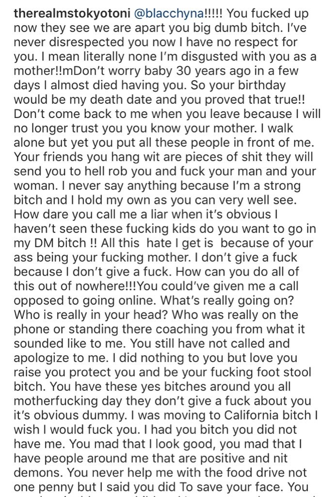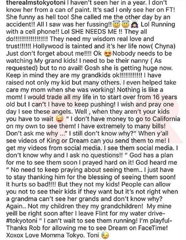 The 46 year old woman has gone ballistic on her daughter for cutting her out of her life – Tokyo accused Chyna of keeping her grand children, King and Dream, away from her and not assisting her financially.