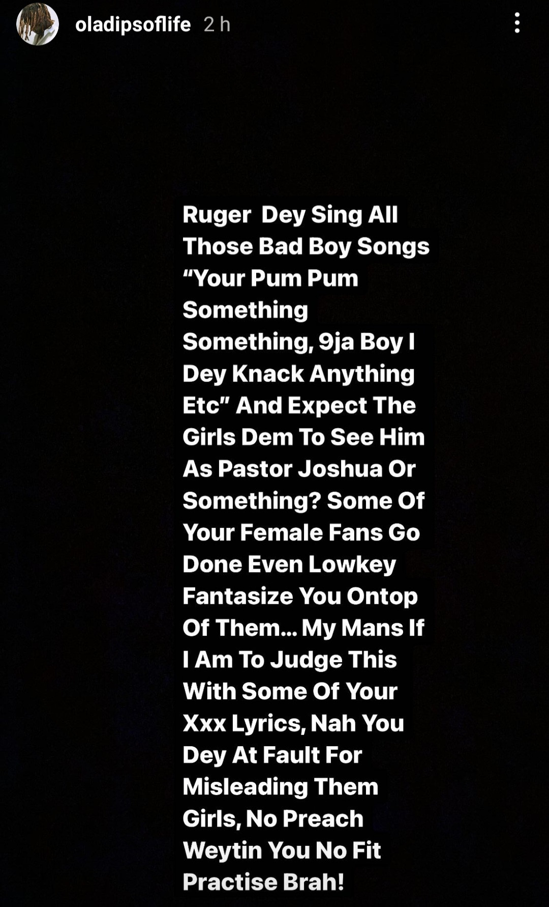“Ruger dey sing all those bad boy songs ‘your pum pum something somethinh, 9ja Boy I dey knack anything e.t.c, and expect the girls dem to see him as a pastor Joshua or something ? Some of your female fans go done even lowket fantasize you ontop of the them…My mans if I am to judge this with some of your xxx lyrics, nah you dey at fault for misleading them girls, No preach wetin you no fit practice brah”.