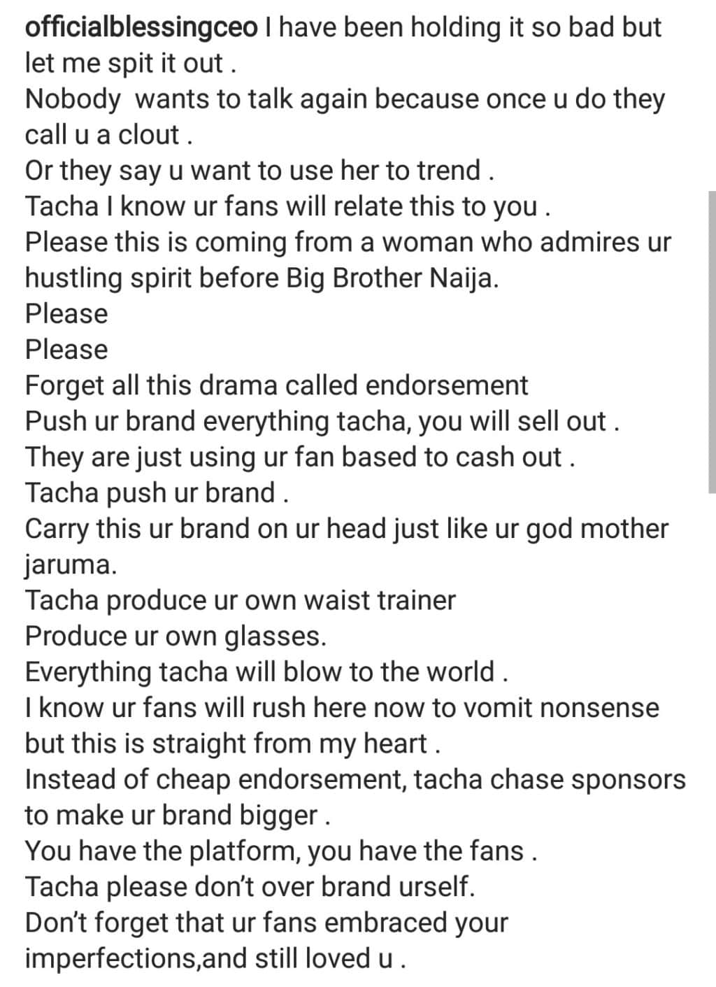 Instagram Blogger, Blessing Okoro, has taken to her Instagram to advice rave of the moment, Tacha to forget cheap endorsement deals and focus on growing her own brand ‘Everything Tacha’.
