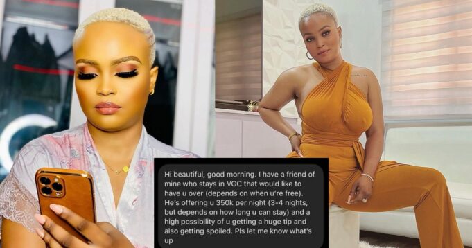 “Hi beautiful, good morning, I have a friend of mine who stays in VGC that would like to have u over (depends on when u’re free). He’s offering u 350k per night (3-4 nights, but depends on how long u can stay) and a high possibility of u getting a huge tip and also getting spoiled. Pls let me know what’s up,” the message reads.