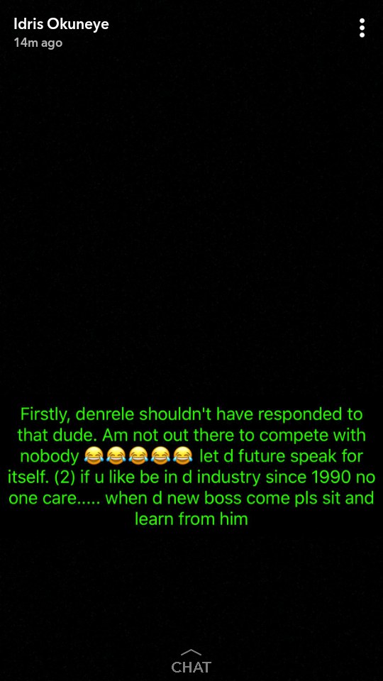 Firstly, denrele shouldn’t have responded to that dude. Am not out there to compete with nobody let d future speak for itself. (2) if u like be in d industry since 1990 no one cae….. when d new boss come pls sit and learn from him