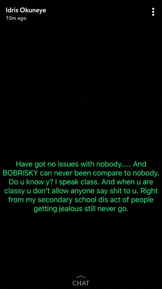 Have got no issues with nobody….. And BOBRISKY can never been compare to nobody. Do u know y? I speak class. And when u are classy u don’t allow anyone say shit to u. Right from my secondary school dis act of people getting jealous still never go.